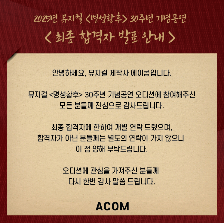 ¹ÂÁöÄà <¸í¼ºÈ²ÈÄ> 30Áֳ⠱â³ä°ø¿¬ ¿Àµð¼Ç ÃÖÁ¾ ÇÕ°ÝÀÚ ¹ßÇ¥